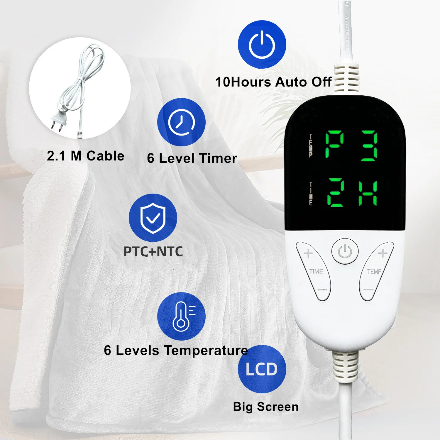 Nooit meer koud in bed of op de bank. Dankzij deze deken met 6 warmtestanden kun je zelf de temperatuur bepalen. Dit doe je op het bedieningspaneel met digitaal display, ook met een timer (2/4/6/8/10 hours). De deken is gemaakt van zacht coral fleece met aan de binnen zijde als afwerking teddy stof.