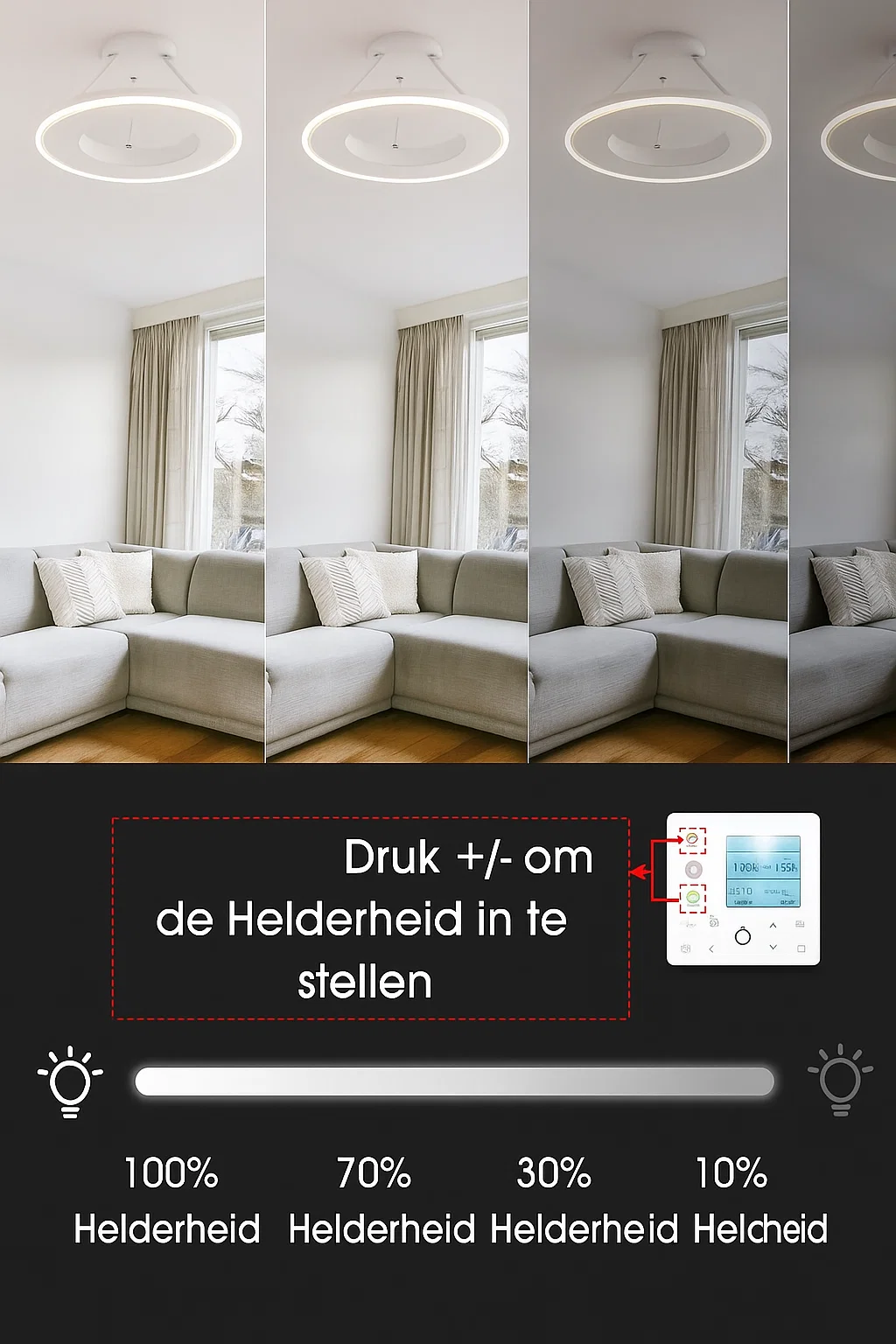 Het paneel is uitgerust met geïntegreerde LED-verlichting die functioneel én sfeervol is, met een lichtopbrengst van circa 4816 lumen. Deze verlichting is in intensiteit verstelbaar, zodat u eenvoudig de gewenste sfeer creëert in elke ruimte. Dankzij het moderne ronde design is dit paneel niet alleen een praktische, maar ook een esthetische toevoeging aan het interieur.