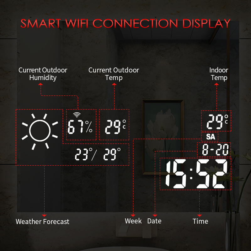 Mooie spiegel! Smart weerbericht werkt prima! Ophangsysteem is wat fragiel en zit niet precies recht op de spiegel gemonteerd! voor de tijd alles goed na meten en niet de mal gebruiken die erbij zit. Verder gewoon een prachtige spiegel die ook als verwarming gebruikt kan worden.